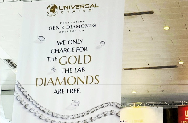 Universal Chains caused a stir at the Jewellery & Gem World (JGW) show in Hong Kong last week with a poster for its Gen Z Diamonds that read: "We only charge for the gold, the lab diamonds are free."